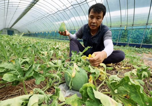지난 13일 광주 북구 금곡동 무등산수박마을에서 농장주 문광배 씨가 최근 과한 습도와 햇빛 과다 등 오락가락하는 날씨로 인해 타들어가는 무등산수박 잎을 만지고 있다. [연합] |