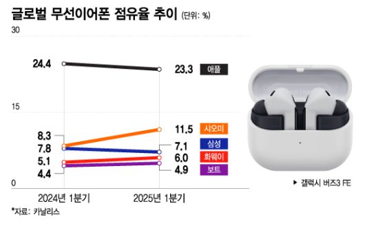 글로벌 시장에서 삼성의 입지는 다소 약화됐다. 시장조사업체 카날리스에 따르면 올해 1분기 전 세계 무선이어폰 시장에서 삼성 점유율은 7.1%로 전년 동기 대비 0.7%포인트 감소했다. 같은 기간 1위인 애플의 점유율도 23.3%로 1.1%포인트 줄었다. 반면 중국 샤오미(11.5%)와 화웨이(6.0%)는 점유율을 확대하며 삼성과 경쟁하고 있다.