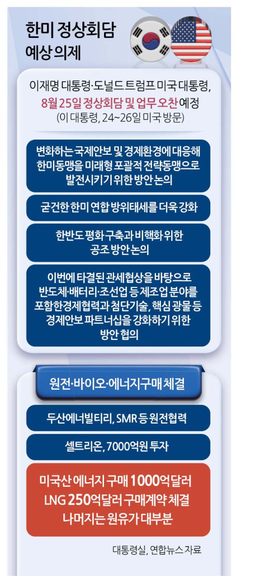 이 대통령은 트럼프 대통령과 관세 협상 후속 논의에 나서 국익 수호에 나설 예정이다. 앞서 우리나라는 1000억달러 규모의 액화천연가스 구매를 포함해 총 3500억달러 규모 대미 투자를 약속한 바 있는데, 미국 측은 이와 관련해 구체적인 이행 계획을 요구할 가능성이 있다. 트럼프 대통령은 지난달 SNS에서 양국 관세 협상 타결 소식을 알리면서 “한국이 투자 목적을 위해 큰 액수의 돈을 투자한다는 데 합의했다”며 “이 액수는 이 대통령이 양자 회담을 위해 백악관으로 올 때 발표할 것”이라고 언급하기도 했다.