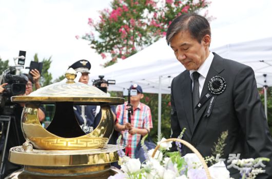 조국혁신당 조국 전 대표가 18일 서울 동작구 국립서울현충원 내 김대중 전 대통령 묘역을 찾아 참배를 하고 있다. 윤창원 기자 |