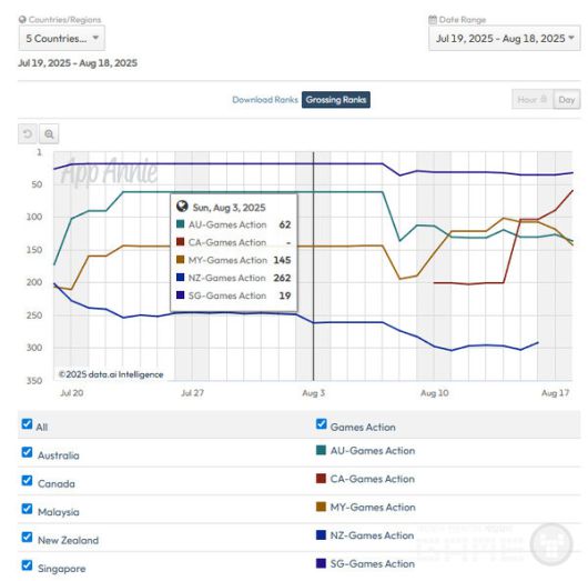 다운로드 순위에서도 고른 성과를 보였다. 전체 게임 순위에서는 싱가포르에서만 순위권에 진입했지만, 게임 카테고리에서는 호주, 캐나다, 싱가포르 3개국에서 순위권을 기록했다. 액션게임 세부 카테고리에서는 5개국 모두 700위권 내에 안착했다.