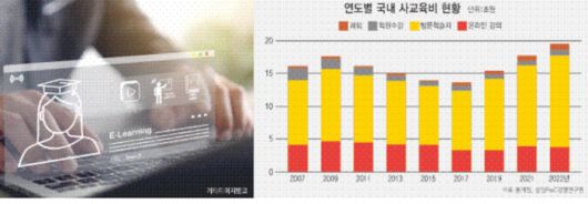 통계청과 삼일PwC경영연구원이 발표한 자료에 따르면, 국내 초·중·고 사교육 시장에서 온라인 교육(유료인터넷·통신강좌 등)이 증가하고 있는 것으로 확인됐다. 온라인 강의는 2017년부터 2022년 5년간 20.4%의 성장률을 보였다. 학교별로 보면, 중학교 25.3%, 고등학교 19.6%, 초등학교 19.1% 순이었다.