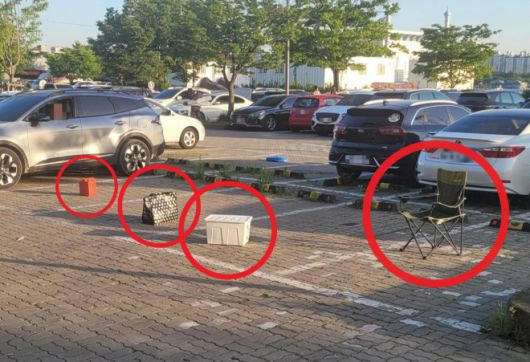 목격자를 대신해 당시 상황을 소개한 글쓴이 A씨는 “이런 식으로 주차 다섯 자리를 찜하고 있다. 상식이 있는 건지”라며 주차장 사진 한 장을 올렸다.