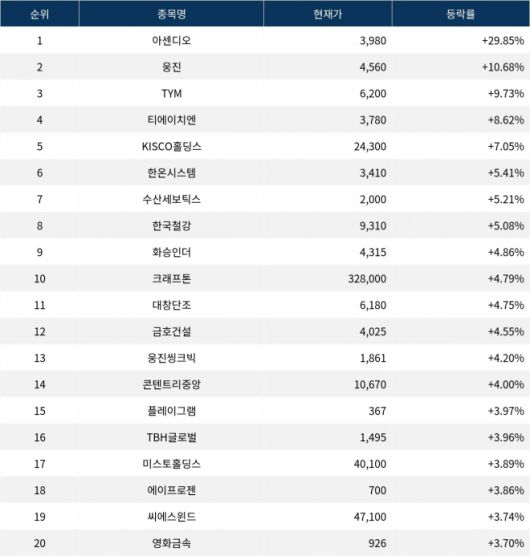 이어 상승률 2위 웅진(016880)은 주가가 10.68% 급등하며 종가 4,560원에 상승 마감했다. 상승률 3위 TYM(002900)의 주가는 6,200원으로 9.73% 상승하며 강세를 보였다. 상승률 4위 티에이치엔(019180)은 8.62% 상승하며 3,780원에 마감했다. 상승률 5위 KISCO홀딩스(001940)는 7.05% 상승하며 종가 24,300원에 마감했다.