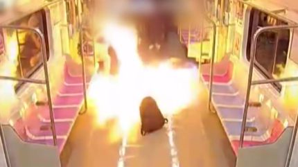 승객들이 놀라 달아나는 사이 남성은 휘발유에 불을 붙입니다.