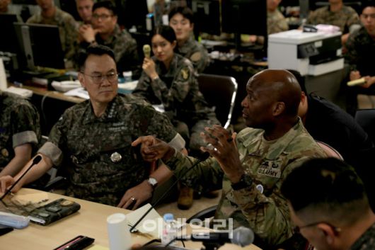 [이데일리 김관용 기자] 김명수 합참의장과 제이비어 브런슨(Xavier Brunson) 한미연합군사령관이 UFS 연습이 진행 중인 연합군사정보지원작전구성군사령부(이하 연정사)를 방문해 작전수행체계를 점검했다.