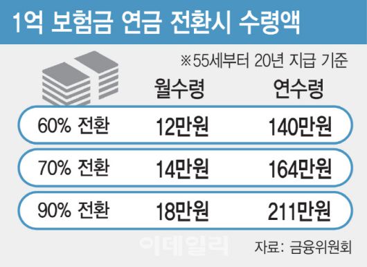 [이데일리 김국배 김형일 기자] 10월부터 55세 이상은 사망보험금을 살아 있을 때 연금 형태로 받아 쓸 수 있게 된다. 은퇴 후 연금 개시 때까지 소득 공백을 메운다는 취지다. 다만 일각에선 실질적 수요는 크지 않을 수 있단 분석도 나온다.