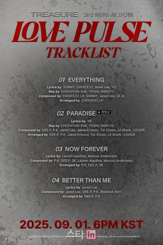 [이데일리 스타in 김현식 기자] 보이그룹 트레저(TREASURE)가 새 앨범 ‘러브 펄스’(LOVE PULSE) 트랙리스트와 참여진을 전격 공개했다.