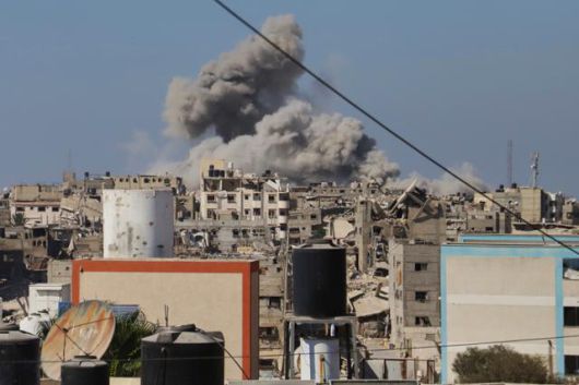 이스라엘군이 18일 가자지구 칸 유니스를 폭격하면서 검은 연기가 솟아오르고 있다. 칸 유니스=AP 연합뉴스 |