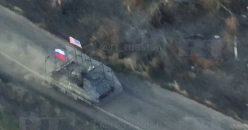 현지시간 18일 러시아 관영 방송 RT가 텔레그램 계정에 올린 영상은 우크라이나 동부 자포리자 한 마을에서 러시아 군인이 탄 장갑차 한 대가 러시아 국기와 미국 국기를 동시에 달고 전장으로 돌진하는 모습을 담고 있습니다.