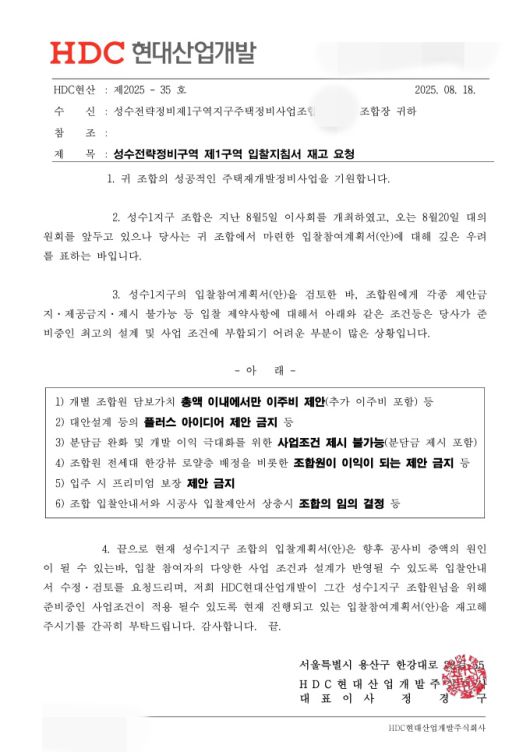 19일 정비업계에 따르면 HDC현대산업개발은 전일 성수1지구 재개발 조합에 입찰지침서 수정 검토를 요청하는 내용의 공문을 보냈다.