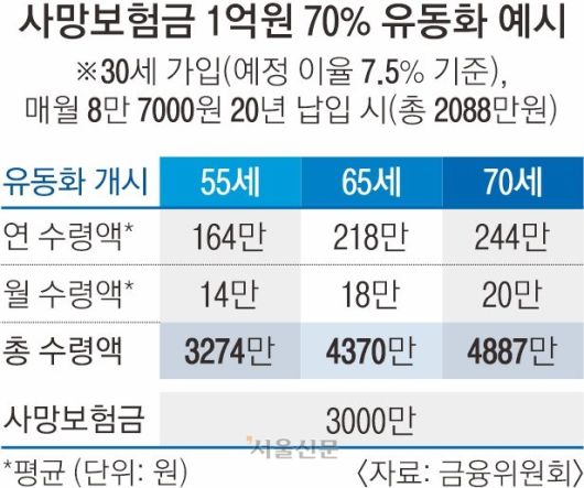 예컨대 사망보험금 1억원짜리 보험계약(30세 가입·월 8만 7000원·20년 납입)을 보유한 경우 55세에 보험금의 70%를 연금형으로 유동화(예정 이율 7.5%·20년)하면 월평균 14만원을 받을 수 있다. 연평균 수령액은 164만원이다. 사망보험금 3000만원은 살아 있는 상태다. 고연령에 개시할수록 많은 금액을 수령할 수 있어 같은 기준으로 70세에 유동화를 개시하면 연평균 244만원을 받을 수 있다. 사망보험금의 최대 90% 이내에서 신청 가능하다. 보험사들은 보험 가입자들에게 유동화 대상임을 개별 통지하기로 했다.