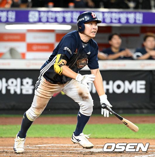 두산도 쉽게 물러서지 않았다. 7회초 1사 후 이유찬이 볼넷으로 걸어나간 뒤 강승호가 우익수 오른쪽에 떨어지는 2루타를 쳤다. 1사 1,2루 찬스에서 정수빈이 해결사로 나섰다. 아이스의 초구를 잡아당겨 1루수 앞에서 크게 바운드돼 우익선상 빠지는 타구를 날렸다. 주자 2명 모두 홈에 들어온 사이 정수빈이 3루까지 달렸다. 몸을 비틀어 태그를 피하며 3루를 터치한 정수빈 센스가 빛났다. 전준호(100개)에 이어 KBO리그 역대 두 번째 90호 3루타 기록도 썼다.