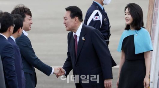 2022년 7월 1일 당시 윤석열 대통령이 북대서양조약기구(NATO·나토) 정상회의 참석을 마치고 성남 서울공항에 도착해 이준석 국민의힘 대표와 악수하고 있다 (사진=대통령실) |