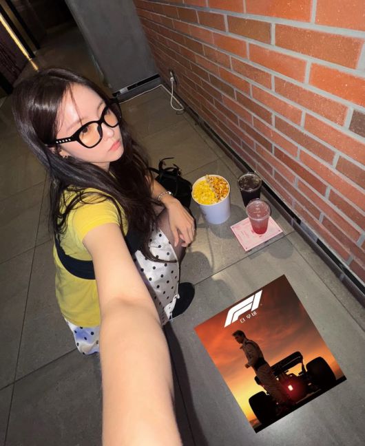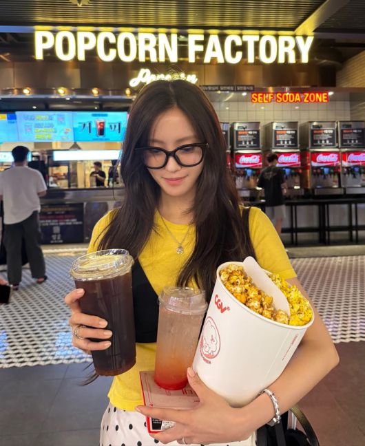 마지막 사진에서는 바닥에 앉아 팝콘과 음료를 두고 인증샷을 남겼다. 스퀘어 블랙 뿔테 안경을 착용해 귀여운 매력을 보여줬으며, 긴 생머리가 자연스럽게 흘러내리며 여유롭고 자유로운 분위기를 자아냈다.