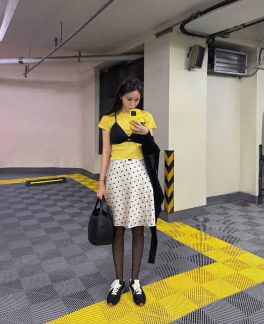 사진 속 효민은 노란색 티셔츠 위에 블랙 브라톱을 레이어드해 과감하면서도 트렌디한 포인트를 줬다. 하의는 화이트 바탕에 블랙 도트 패턴이 들어간 실키한 스커트를 매치해 발랄하면서도 여성스러운 무드를 완성했다.