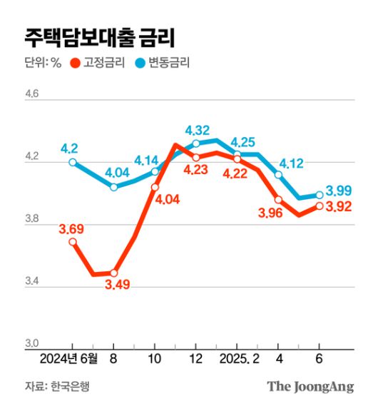주담대 고정금리와의 금리 격차가 좁혀졌다는 점이 눈에 띈다. 지난 6월 기준 전체 예금은행의 주담대 고정금리는 연 3.92%로 변동금리와의 차이는 0.07%포인트다. 1년 전만 해도 변동금리는 연 4.2%로 고정금리(연 3.69%)보다 0.51%포인트 높았다.