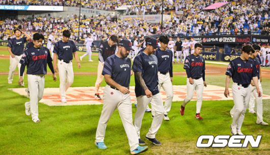 [OSEN=잠실, 박준형 기자] 프로야구 LG 트윈스가롯데 자이언츠를9연패에 몰아넣었다. 롯데는 20년 만에 9연패를 당했다.LG는19일 서울 잠실구장에서 열린 2025 KBO리그 롯데와 경기에서 5-0으로 승리했다. LG는 이날 승리하고, 2위 한화 이글스가 패배하면서 승차를 3경기 차로 벌렸다.경기종료 후 롯데 선수들이 패배에 아쉬워하고 있다. 2025.08.19 / soul1014@osen.co.kr |