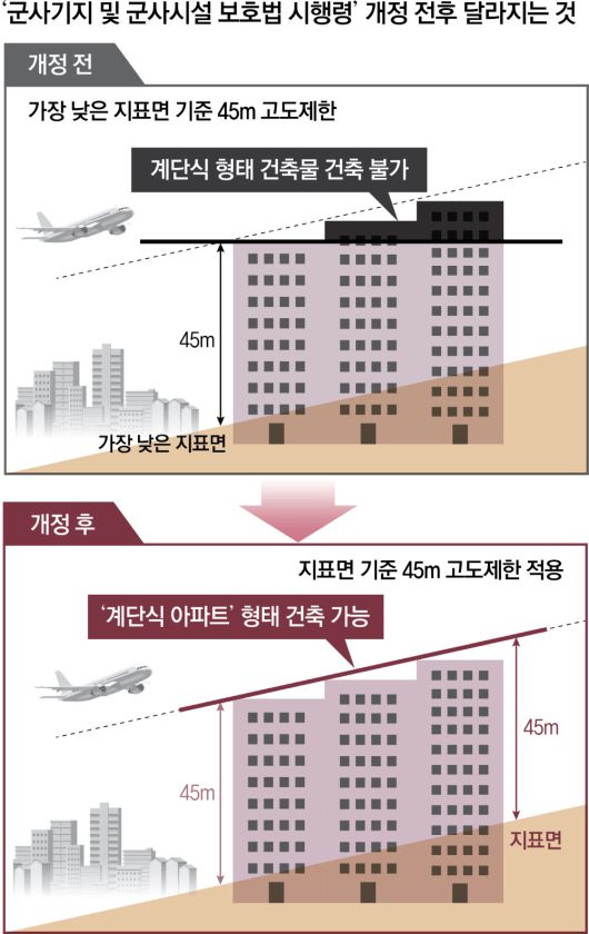 시행령 개전 전에는 경사지에서 아파트 등 건축물을 건축할 때 ‘가장 낮은 부분의 지표면’ 기준에 걸려 경사지 윗부분 대지에선 건물을 낮게 지어야 하는 문제가 발생했다. 경사 지형이라도 개별 건축물을 건축하는 경우엔 시행령 개정 전에도 ‘가장 낮은 부분 지표면’ 기준이 적용되지 않아 별다른 제약이 없었다. 하지만 건축비를 절감해 재개발 사업성을 높이기 위해 건물 여러 동이 이어지도록 하는 방식으로 건축하는 경우엔 이 규정이 적용돼 계단식 형태 건축이 불가능했다. 이에 정비사업이 과도하게 제약되는 한편으로 국민 재산권도 침해한다는 지적이 이어져온 것. 국방부는 “군 작전활동 및 비행 안전에 미치는 영향 없이 경사지 등에서의 불합리한 규제를 해소하고 국민 재산권을 실질적으로 보장할 수 있다”고 개정 취지를 밝혔다.