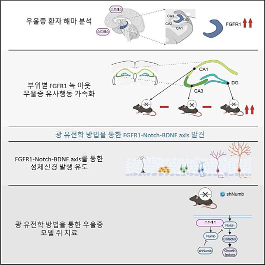 단, 노화된 쥐에서는 FGFR1을 활성화해도 우울 증상이 쉽게 개선되지 않았다. 연구팀의 분석 결과 노화된 쥐의 뇌에서는 ‘Numb’라는 단백질이 과도하게 발현됐는데, 이 Numb가 FGFR1의 활성화를 막고 있었다.