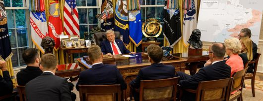 도널드 트럼프 미국 대통령(윗줄 가운데)이 볼로디미르 젤렌스키 우크라이나 대통령, 영국 프랑스 독일 등 유럽 주요국 정상과 18일(현지 시간) 워싱턴 백악관 집무실에서 다자회담을 가졌다. 집무실 오른편에 2022년 2월 우크라이나를 침공한 러시아가 현재까지 점령 중인 우크라이나 남동부 영토가 붉은색으로 표시돼 있다. 사진 출처 백악관 |