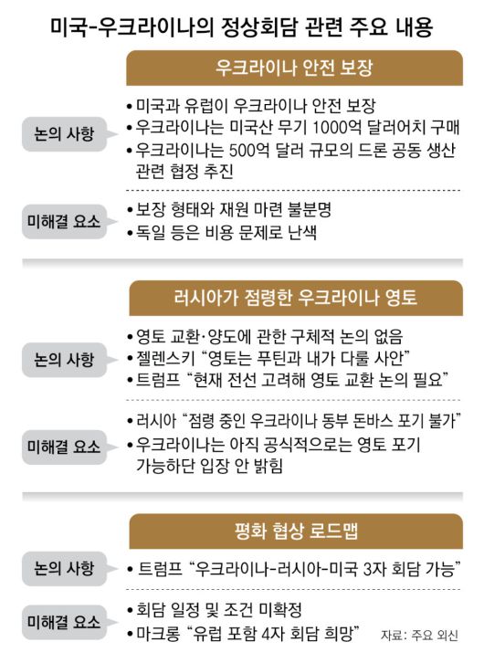 이에 따라 우크라이나 전쟁 종전의 핵심 쟁점으로 꼽히는 ‘우크라이나 안전 보장’에 대해 미국, 우크라이나, 유럽 주요국, 러시아가 모두 일정 수준의 공감대를 형성했다는 분석이 나온다. 이르면 2주 안에 열릴 수 있다는 전망이 나오는 젤렌스키 대통령과 푸틴 대통령의 정상회담에선 2022년 2월 전쟁 발발 후 러시아가 점령 중인 우크라이나 영토를 둘러싼 논의가 어떻게 진행될지에 관심이 모아진다. 다만 트럼프 대통령은 19일 폭스뉴스 인터뷰에서 안전보장 방안에 관해 “미군의 우크라이나 주둔은 없을 것” 이라고 말했다.