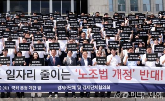 한국경영자총협회(경총)와 대한상공회의소, 한국경제인협회, 한국무역협회, 중소기업중앙회, 한국중견기업연합회 등 경제 6단체는 19일 국회 본관 앞 계단에서 국민의힘 김형동 의원과 함께 '노동조합법 개정 반대 재계 결의대회'를 열었다.