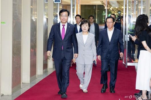 (서울=뉴스1) 유승관 기자 = 송언석 국민의힘 비상대책위원장 겸 원내대표를 비롯한 중진 의원들이 19일 서울 여의도 국회에서 본회의 일정 연기 등 현안 관련 우원식 국회의장을 만나기 위해 의장실로 들어서고 있다. 2025.8.19/뉴스1 Copyright (C) 뉴스1. All rights reserved. 무단 전재 및 재배포, AI학습 이용 금지. /사진=(서울=뉴스1) 유승관 기자