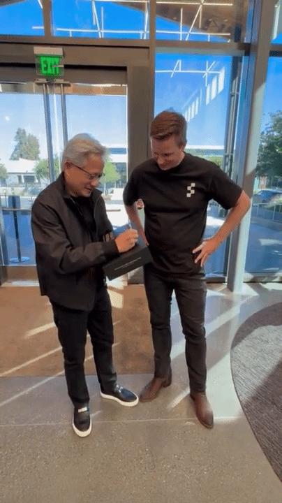젠슨황 엔비디아 CEO(왼쪽)와 브렛 애드콕 피규어AI CEO가 나란히 서 있는 영상. 젠슨황 CEO가 선물 상자에 메시지를 적고 있다. [사진=브렛 애드콕 피규어AI CEO X계정] |