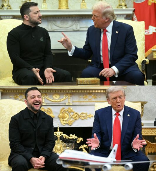 도널드 트럼프 미국 대통령(왼쪽)과 볼로디미르 젤렌스키 우크라이나 대통령의 지난 2월(위), 8월 18일(아래) 백악관 회동 비교.(사진=AFP) |