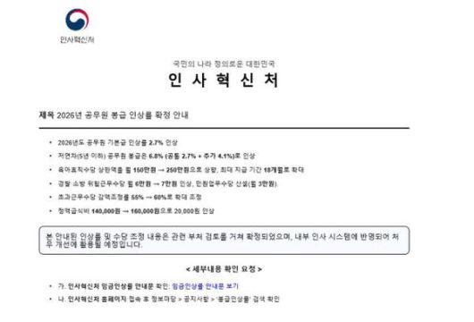 이와 관련해 인사혁신처는 현재 공무원 임금 인상안 등에 대한 최종 의사결정을 앞두고 있다. 내년도 공무원 보수 수준을 심의·의결하는 인사혁신처 산하 공무원보수위원회(공보위)는 지난달 21일 2026년도 공무원 임금 인상률을 2.7~2.9%로 결정했다.