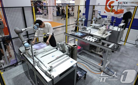 (서울=뉴스1) 구윤성 기자 = 20일 서울 강남구 코엑스에서 열린 '2025 대한민국 섬유교역전(프리뷰 인 서울 2025)에서 참관객들이 로봇기반 자동봉제시스템을 활용한 마이크로팩토리를 살펴보고 있다. 2025.8.20/뉴스1kysplanet@news1.krCopyright ⓒ 뉴스1. All rights reserved. 무단 전재 및 재배포, AI학습 이용 금지.
