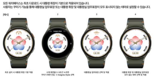 한편 대통령실은 국민 요청을 반영해 대통령 휘장을 활용한 애플워치용 배경 화면 4종도 함께 제작해 △안드로이드 스마트워치용 워치페이스 5종 △애플워치용 7종 △스마트폰 공용 배경화면 3종으로 구성된 총 15종의 디지털 굿즈를 공개했다.