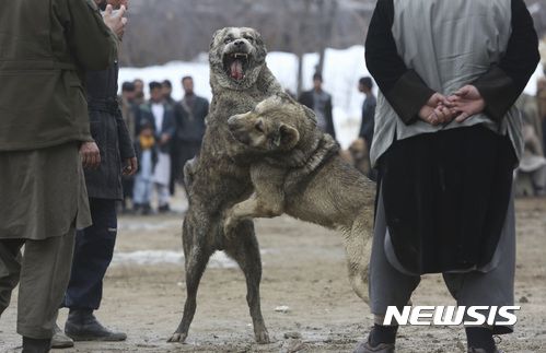 [카불=AP/뉴시스] 17일 아프가니스탄 수도에서 남자들이 1주일에 한 번씩 열리는 투견 대회에서 개 싸움을 보고 있다. 아프간 겨울 오락으로 주휴인 금요일마다 공개적으로 진행된다. 다행히 개들은 죽을 때까지 싸우지 않고 도망가거나 하면 끝난다. (사진=뉴시스DB) |