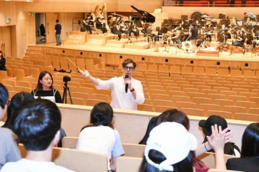 부천아트센터에서 열린 부천필 오픈리허설에서 아드리앙 페뤼숑 선임 지휘자가 공연장과 연주곡에 대해 학생들에게 설명하고 있다. 2025.7.24 부천시 |