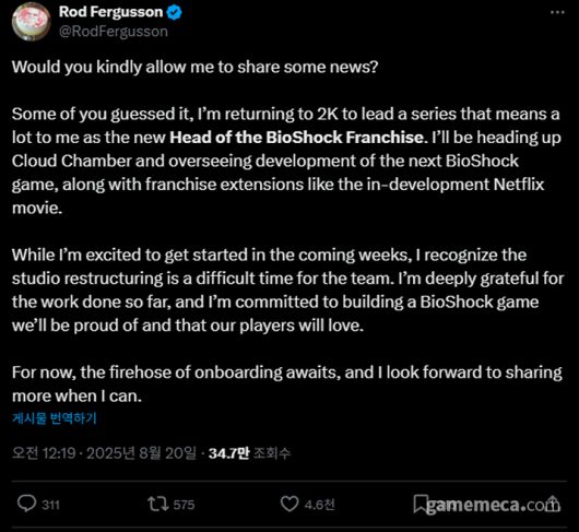▲ 바이오쇼크 프랜차이즈를 이끌게 되었다고 밝힌 로드 퍼거슨 (사진출처: 로드 퍼거슨 공식 X) |