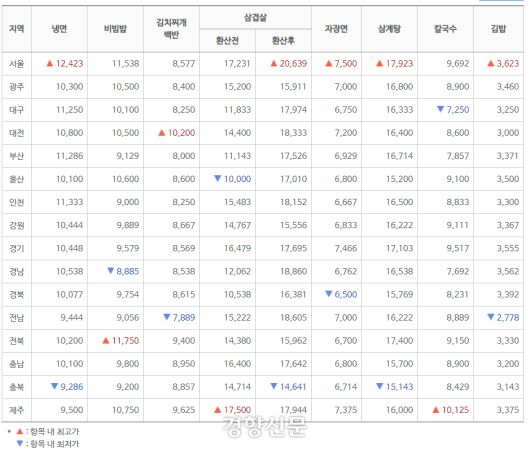 서울 지역 외식 가격을 턱밑에서 추격하는 곳도 있다. 냉면의 경우 부산(1만1286원), 대구(1만1250원), 인천(1만1333원) 등이 서울 지역 평균 가격(1만2423원)과 엇비슷했다.