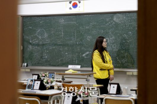세월호 참사 희생자 임경빈 학생의 모친 전인숙 씨가 2024년 3월17일 경기 안산 단원고4.16기억교실에서 아들의 자리를 살펴보고 있다. 문재원 기자 |