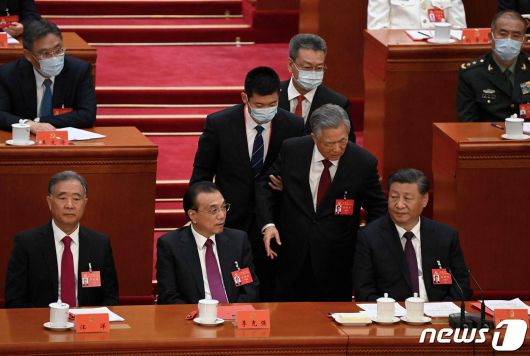 지난 2022년 10월 22일 베이징 인민 대회당에서 열린 중국공산당 20차 당 대회의 폐막식 중 후진타오 전 국가주석이 퇴장하며 리커창 총리, 왕양 정협 주석과 나란히 앉은 시진핑 국가주석에게 무언가 말하는 모습. ⓒ AFP=뉴스1 ⓒ News1 우동명 기자 |