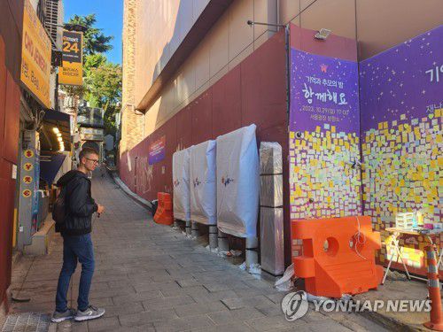 이태원역 앞 마련된 '기억과 안전의 길'을 바라보는 외국인 |