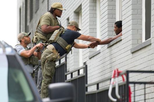 무장한 요원들이 19일 워싱턴 북서쪽 페트워스의 한 아파트에서 남성에게 수갑을 채우고 있다. 이 요원들이 입고 있는 셔츠에는 '워싱턴 현장 사무실'이라는 글씨와 함께 '경찰'이라는 글씨가 써 있다. 워싱턴=AP 연합뉴스 |