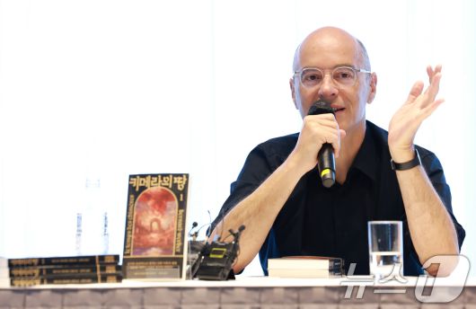 프랑스의 천재 작가 베르나르 베르베르가 20일 오후 서울 중구 앰배서더 서울 풀만 호텔에서 가진 ‘카메라의 땅’ 출간 기념 방한 기자간담회에 참석해 책 소개를 하고 있다. '키메라의 땅 1, 2'는 핵전쟁 이후의 디스토피아적 미래를 배경으로, 새로운 지구 지배 종족인 '키메라'의 등장과 다양한 종족과의 갈등 속 인류의 운명에 질문을 던지는 이야기를 그렸다. 2025.8.20/뉴스1 ⓒ News1 권현진 기자 |