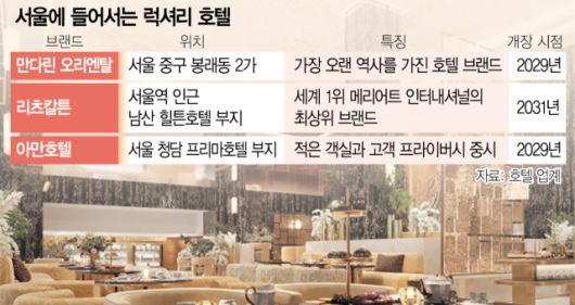 만다린 오리엔탈, 리츠칼튼, 아만 등 5성급 호텔이 서울에 속속 들어설 전망이다. 외국인 관광객 증가 분위기 속에 고금리 기조가 장기화되면서 건축 비용이 증가하자 호텔 업계가 고급화로 선회한 것이란 분석이 나온다.
