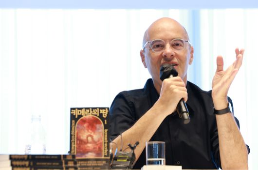 프랑스 작가 베르나르 베르베르(64)는 20일 오후 서울 중구의 한 호텔에서 열린 장편소설 『키메라의 땅』(총 2권, 열린책들) 출간기념 기자간담회에서 작품을 이렇게 소개했다.