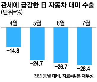 20일 일본 재무성이 발표한 ‘7월 무역통계 속보치’에 따르면 7월 대미 수출액은 지난해 같은 기간보다 10.1% 감소한 1조7285억엔(약 16조4000억원)을 기록했다.