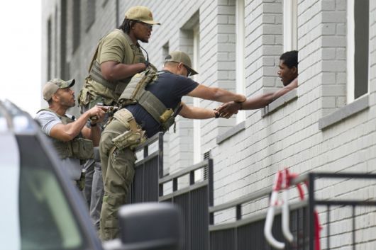 흑인 남성에게 수갑 채우는 美경찰 - 도널드 트럼프 미국 행정부의 이민 단속이 갈수록 강화되는 가운데 19일(현지시간) 워싱턴DC 북서부 펫워스 지역의 한 아파트 단지에서 무장 경관들이 아파트 창문 밖으로 손을 내민 흑인 남성에게 수갑을 채우고 있다. 워싱턴DC AP 뉴시스 |