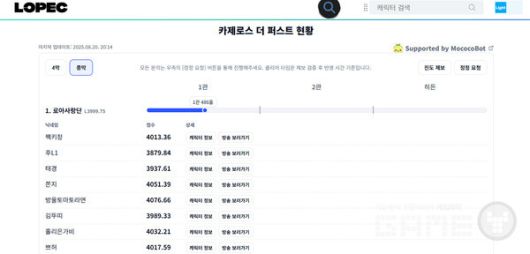 이 과정에서 모험가들이 가장 주목하는 것은 각 공대의 진도를 확인할 수 있는 현황판이다. 팬들에게 익숙한 '로펙'은 카제로스 더 퍼스트 도전 현황판을 제공하며, 현재 등록된 52개 공격대의 진행 상황을 실시간으로 보여준다. 각 공대별 관문 도달 시점과 클리어 시간은 물론, 방송을 진행하는 경우 스트리밍 링크도 함께 연결돼 있어 유저들은 현황판을 통해 공략 과정을 직접 시청할 수 있다. 단순한 경쟁을 넘어 커뮤니티적 응원과 참여가 더해지는 셈이다.