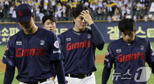 (서울=뉴스1) 장수영 기자 = 20일 서울 송파구 잠실야구장에서 열린 프로야구 '2025 신한 SOL 뱅크 KBO리그' 롯데 자이언츠 대 LG 트윈스 경기에서 패배하면서 22년 만의 10연패 수렁에 빠진 롯데 선수들이 어두운 표정으로 경기장 밖으로 이동하고 있다. 2025.8.20/뉴스1