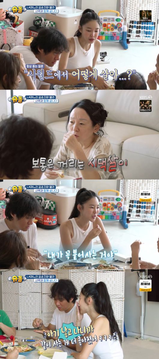 그러자 김윤지는 "사람들이 그렇게 얘기할 때마다 시월드에 들어가 사는 게 아니라 꼭 붙어서 사는 거라고 (한다)"면서 "어머님이 맛있는 거 맨날 해주시지, 선물 들어오는 거 다 나눠주시지, 가끔 여행가면 큐로(반려견)도 봐주시지. 너무 감사하고 편했는데 솔직히 아기 낳고 나니까 더 편하긴 하다"며 너스레를 떨었다.