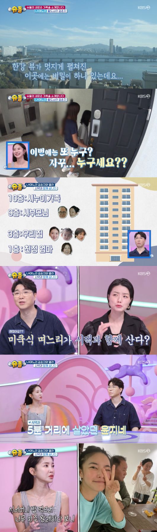김윤지는 "저희가 워낙 왕래가 잦고, 어차피 자주 가기 때문에 엘리베이터 왔다 갔다 하는 게 훨씬 편리하지 않을 까라는 생각에 다 같이 살게 됐다"면서 "1층에는 저희 친정엄마가 살고 계시고, 3층에는 엘라 패밀리, 9층에는 시부모님, 10층에는 시누이 언니 댁이 살고 있다"고 밝혔다.